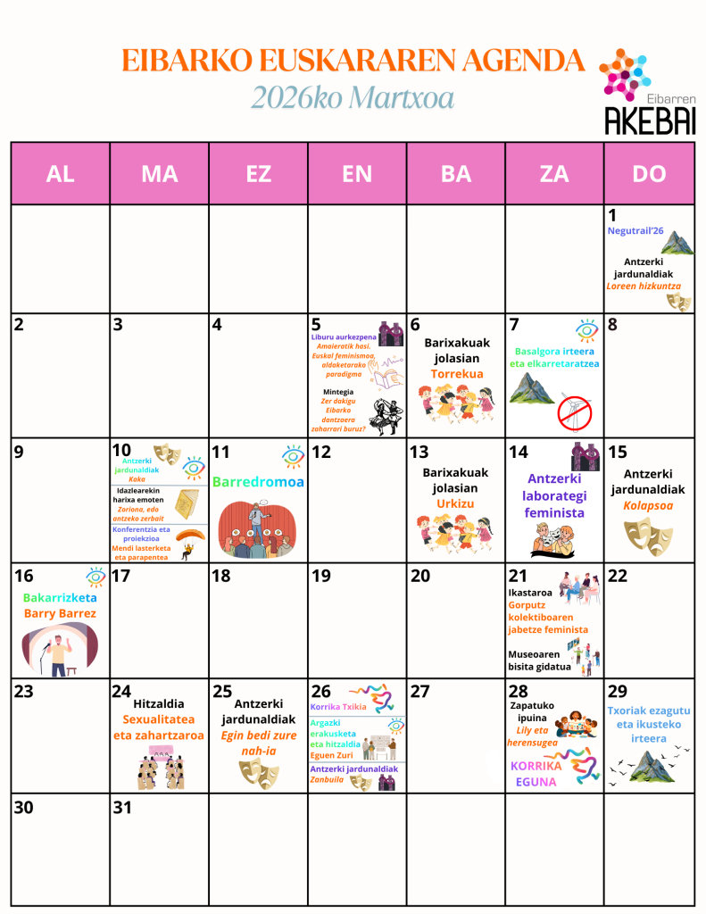 Martxoa bete-beteta dator! Eibarko hainbat erakunde, elkarte, eragile eta talderen eskutik antolatutako ekintzaz osatuta dago hilabete honetako Euskararen Agenda.